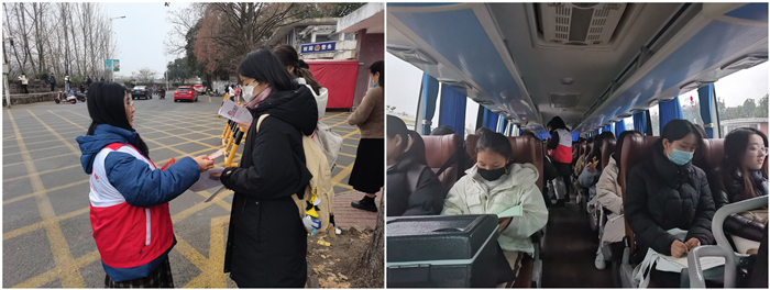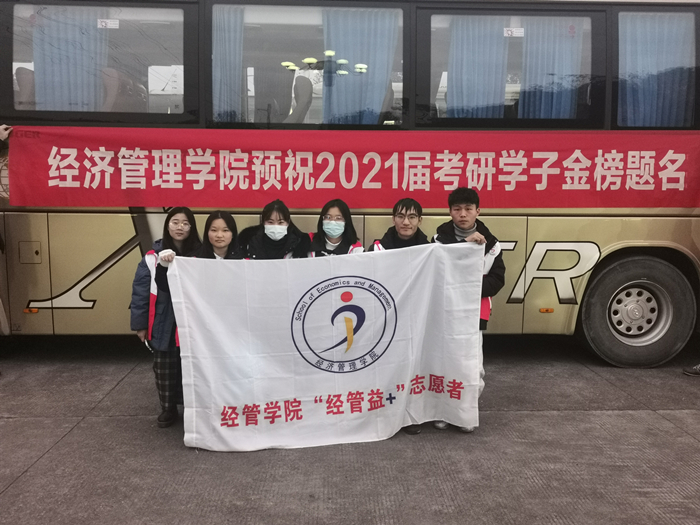 12月26日、27日,经济管理学院在横江校区正大门为考研学生准备了两辆爱心送考专车,该院“益+”志愿者队队员们也早早来到现场为其护航。