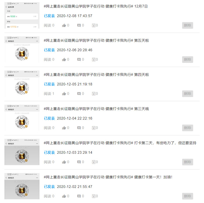 此次活动得到各学院学生的热烈响应,共吸引了3261人报名参与。活动要求参与活动的同学通过微信运动小程序记录当天步数,步数达到一万六千步即为达标,步数达标的同学通过易班APP的易瞄瞄模块发布“网上重走长征路 黄山学院学子在行动 健康打卡我先行”话题并上传微信运动截图即完成一天的打卡,连续打卡15天以上即可获得相应的学分。活动期间,校园内随处可见散步或跑步的同学,负责人认真监督,及时提醒参与的同学及时完成打卡。