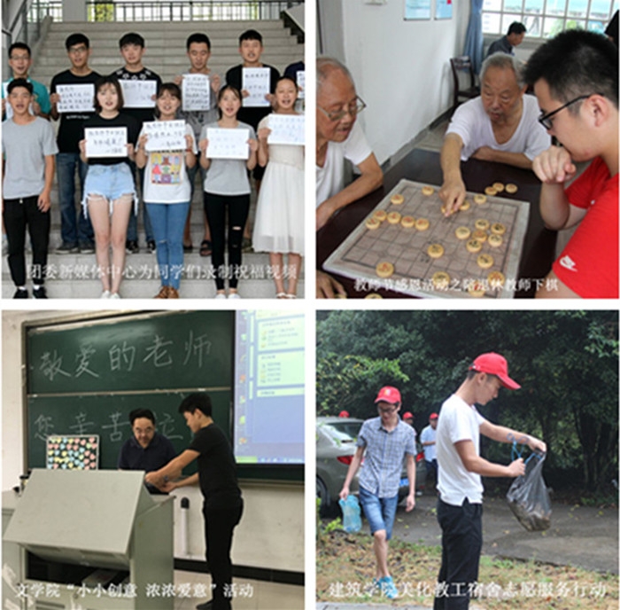 各学院团总支、学生会也纷纷开展了丰富多彩的主题活动。文学院开展了“小小创意,浓浓爱意”祝福活动;艺术学院“师恩在心中,感念见行动”教师节特别活动;建筑工程学院开展了美化南校区老教工宿舍志愿服务活动;旅游学院和教育学院开展了“庆祝教师节,老师我想对您说”线上活动等等。