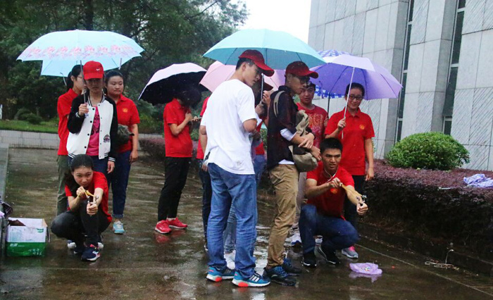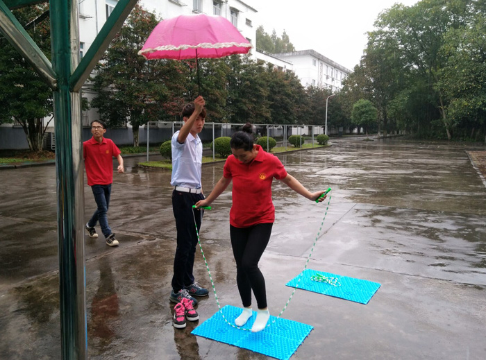 尽管活动当天下着小雨,但仍不能阻止同学们参赛的热情。各学院三人一组,共同完成各个赛点的接力。本次活动分别有踢毽子、套圈、弹弓、大象鼻子转圈、指压板跳绳和吹气球等六个环节。游戏第一关是踢毽子,在选手累积完成二十个之后给予选手通关卡片,踢毽子游戏在考验选手的身体协调能力同时,也将选手们思绪拉回了童年时期。随后的大象鼻子转圈、指压板跳绳等活动也让参与者乐在其中。为增加活动的趣味性还设置了神秘地点,外国语学院代表队经历重重考验后第一个到达神秘地点,获得神秘礼品奖励。