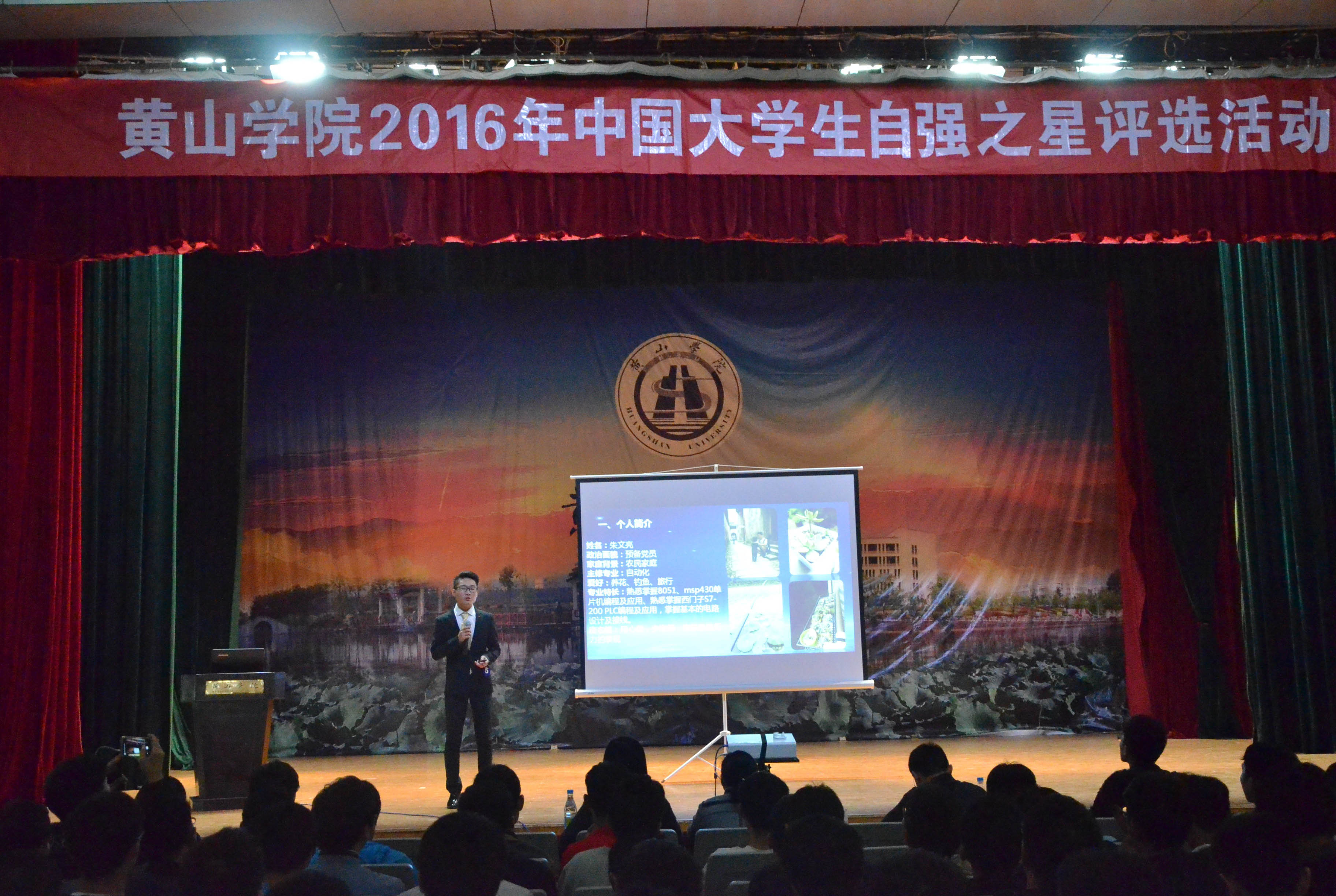 通过网上报名、微博、微信的转发和点赞、微视展示、现场汇报等环节,最终文化与传播学院的李超和沈梦成获得“黄山学院大学生自强之星标兵”称号;机电工程学院的朱文亮、黄旭龙、朱琳、杨彪,经济管理学院的陈敏玲,外国语学院的薛艳,化学化工学院的徐晓飞,生命与环境科学学院的王瑞,旅游学院的张晨,教育科学院的徐春霞获得“黄山学院自强之星”称号。同时,机电工程学院和文化与传播学院学生会获得2016年度“寻访中国大学生自强之星”活动“优秀组织奖”。