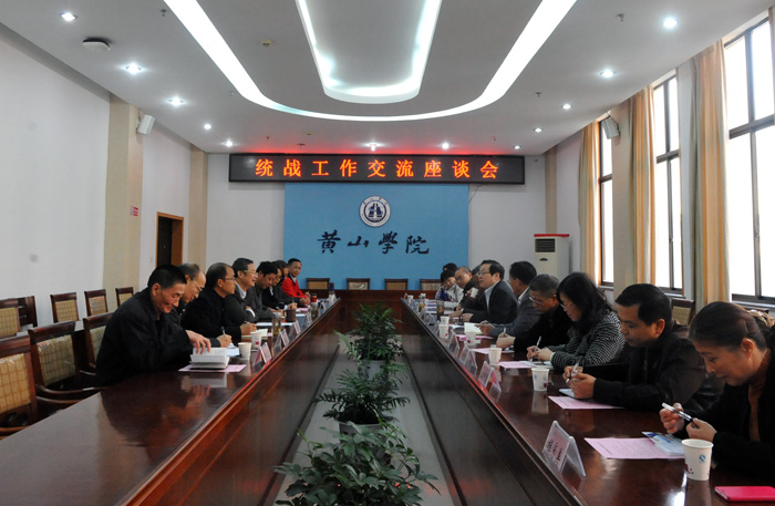 座谈会上,叶军对孙晓峰一行来我校交流统战工作表示欢迎。他指出,池州学院和黄山学院两校就统战工作开展交流很有必要,双方的合作空间很大,希望双方今后加强合作交流,相互学习,相互借鉴,共同提高。校党委委员、统战部部长张德学从领导重视、机构设置、工作谋划、工作成效等方面汇报了我校统战工作。孙晓峰高度评价了我校统战工作取得的成效,简要介绍了池州学院统战工作情况及各民主党派发挥自身作用服务学校改革发展、服务地方经济建设方面的积极举措。