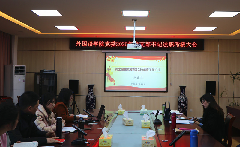 1月19日下午,外国语学院党委在逸夫综合楼5402会议室召开2020年度党支部书记抓基层党建述职评议考核大会。学院党委委员、各党支部书记、工会负责人等参加会议,会议由该院党委书记、院长黄先进主持。