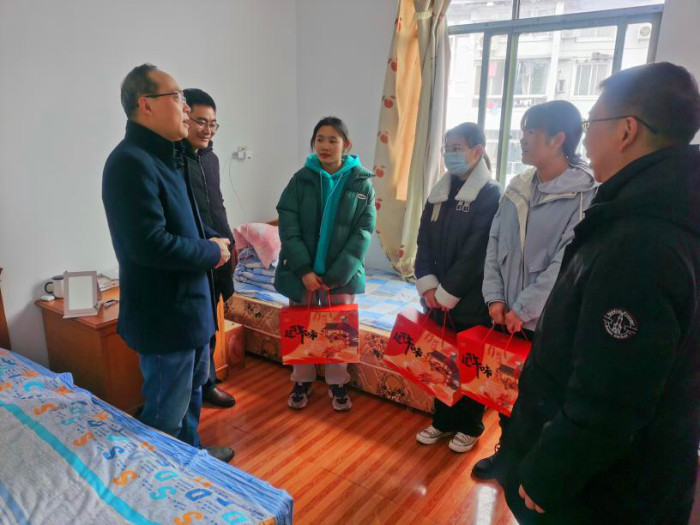 2月8日上午,旅游学院党委书记陶卫平,党委副书记、院长金声琅,副院长孙克奎,院团委书记项昱及辅导员刘宁晖一行五人来到留黄山的河北籍三位同学的宿舍,向学生们送去了新春的祝福。