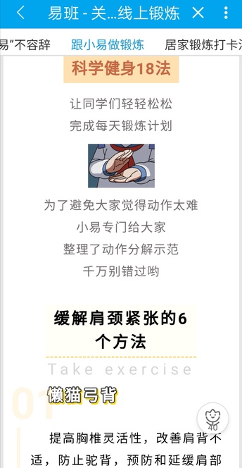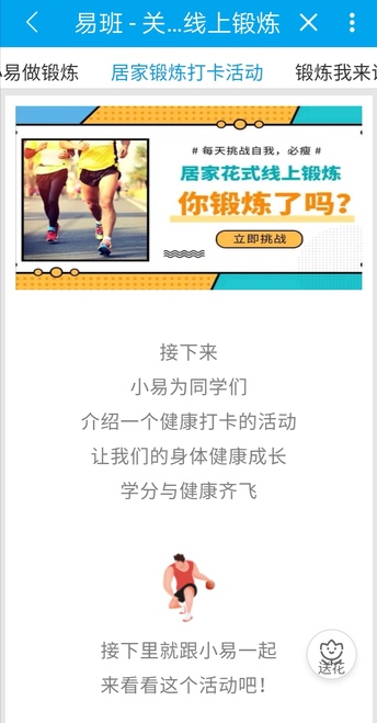 本次活动主要通过在易班搭建轻应用和创建易班优课课群的方式开展。轻应用分为锻炼“易”起来、跟小易做锻炼、居家锻炼打卡活动、锻炼我来说四个板块。参与活动的同学通过轻应用的学习了解到运动的重要性,学习到多种运动锻炼方法,还可以在评论区畅谈自己的锻炼心得,表达了他们对运动的热爱。他们在易班优课中上传不少于一分钟的锻炼视频和截图,上传的锻炼视频种类繁多,有跑步、跳绳、篮球、乒乓球、呼啦圈等多项运动。据悉,此次活动轻应用页面浏览量近1000人次。活动前期通过学工在线微信公众号和易班主页进行宣传推广,学生参与度较高,活动取得较好效果。