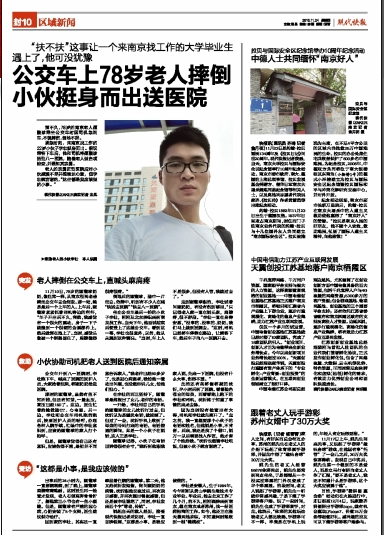 11月24日,《现代快报》第10版以《78岁老人公交上摔倒小伙毫不犹豫送医院》为题,报道我校生物技术专业2016届毕业生李壮在南京热心救助摔倒老人的事迹。李壮的正能量引起了媒体的广泛关注,凤凰网、人民网、新浪网、搜狐网、网易等众多网站转发了该条新闻。