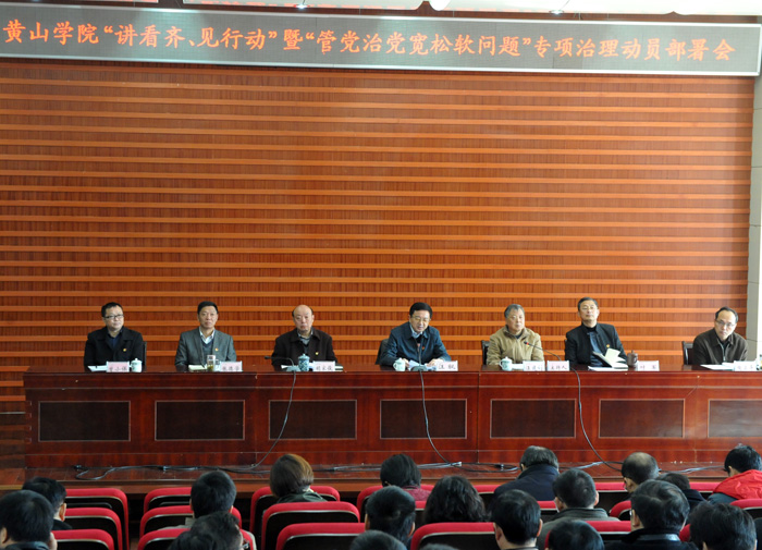 汪枫在动员讲话中回顾总结了党的十八届六中全会、安徽省第十次党代会等会议精神;深刻阐述了开展“讲看齐、见行动”学习讨论和“管党治党宽松软问题”专项治理工作的重大意义;明确提出了开展学习讨论和专项治理的具体举措。他指出,开展“讲看齐、见行动”学习讨论,是省委从强化“四个意识”的政治高度作出的重大决策。根据中央关于认真学习宣传党的十八届六中全会精神的总体要求和省委的具体部署,校党委决定,在全校党员干部重点是处级以上领导干部中开展“讲看齐,见行动”学习讨论,旨在以学习讨论为重要抓手和具体步骤,教育党员干部增强看齐的思想自觉和政治自觉,把全面从严治党决策部署变为实际行动,为加快建设地方应用型高水平大学,推动学校各项事业持续健康发展,提供坚强保障。他强调,一要统一思想认识,以坚决的政治态度,进一步增强“讲看齐、见行动”学习讨论的政治自觉。看齐是重大的政治原则,是党的力量所在、优势所在。讲看齐,不是党员干部个人的小事,而是事关政治方向的大事;不是一般的品行要求,而是党性要求。全校各级党组织和广大党员干部要强化责任担当,充分认识开展“讲看齐、见行动”学习讨论的重要意义,切实把思想和行动统一到省委决策部署上来,深入学习贯彻十八届六中全会精神,“讲看齐、见行动”,确保各项事业始终沿着正确方向阔步前进。坚持“讲看齐、见行动”,是坚持党中央集中统一领导的内在要求;坚持“讲看齐、见行动”,是学习贯彻党的十八届六中全会精神的重要抓手;坚持“讲看齐、见行动”,是持续深化“两学一做”学习教育的重要举措;坚持“讲看齐、见行动”,是践行新发展理念、促进思想解放的强大动力。二要强化对标看齐,以强烈的责任担当,进一步落实“讲看齐、见行动”学习讨论的各项部署。“看齐”的本质要义在于树立标杆、规范行动,根本目的在于凝聚共识、汇聚力量。各级党组织和广大党员干部都应牢牢把握增强“四个意识”特别是核心意识、看齐意识这个关键,自觉把看齐意识内化于心,外化于行,把“讲看齐、见行动”的学习讨论抓好、抓实、抓到位。要坚定不移树牢核心意识,坚定不移向党中央看齐,坚定不移向党的理论和路线方针政策看齐,坚定不移向党中央和省委的决策部署看齐。三要加强统筹协调,以有力的政治行动,进一步推进“讲看齐、见行动”学习讨论的扎实开展。要以严的要求、实的作风、真的担当,坚决落实学习讨论各项任务要求,更加坚定地维护以习近平同志为核心的党中央权威,更加扎实地把党中央和省委的各项决策部署落到实处。要强化责任落实,切实加强组织领导;深化学习研讨,切实增强活动实效;坚持统筹兼顾,切实推进学校工作。