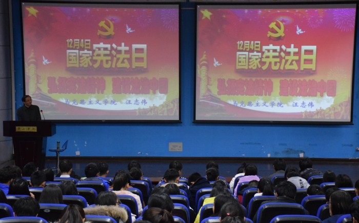 此次报告会邀请到马克思主义学院汪志伟老师主讲,他以“弘扬宪法精神营造法治校园”为题,深入讲解宪法内容,引导学生了解宪法、尊崇宪法、增强法治观念。报告会中,汪志伟向同学们介绍了宪法的特征,强调宪法的生命在于实施,宪法的权威也在于实施。他建议同学们能够认真体会,多加思考,努力提高个人的法律修养,做一名知法、懂法、守法的合格公民,从而为推进我国法治化进程做出贡献。会后,同学们纷纷表示,此次报告会,让他们对宪法有了更深的认识,在以后的生活中会自觉学法,守法。当自身利益受到损害时,学会用法律武器维护自身利益。