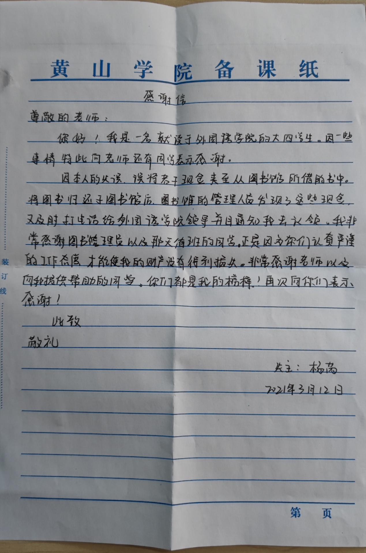 近日,图书馆收到一封外国语学院学生的感谢信。感谢信称,3月11日下午,该同学到图书馆文学第一阅览室归还所借图书并离开后,图书馆管理员潘晓峰老师整理图书时发现书中夹有多张百元现金,经点数整一千元。潘晓峰老师与当班负责人李仿梅老师立即查询此图书的借还记录,确定了归还此书的学生的姓名与所在学院,联系外国语学院领导通知该学生,认真核对学生信息无误后,二人将现金悉数归还。