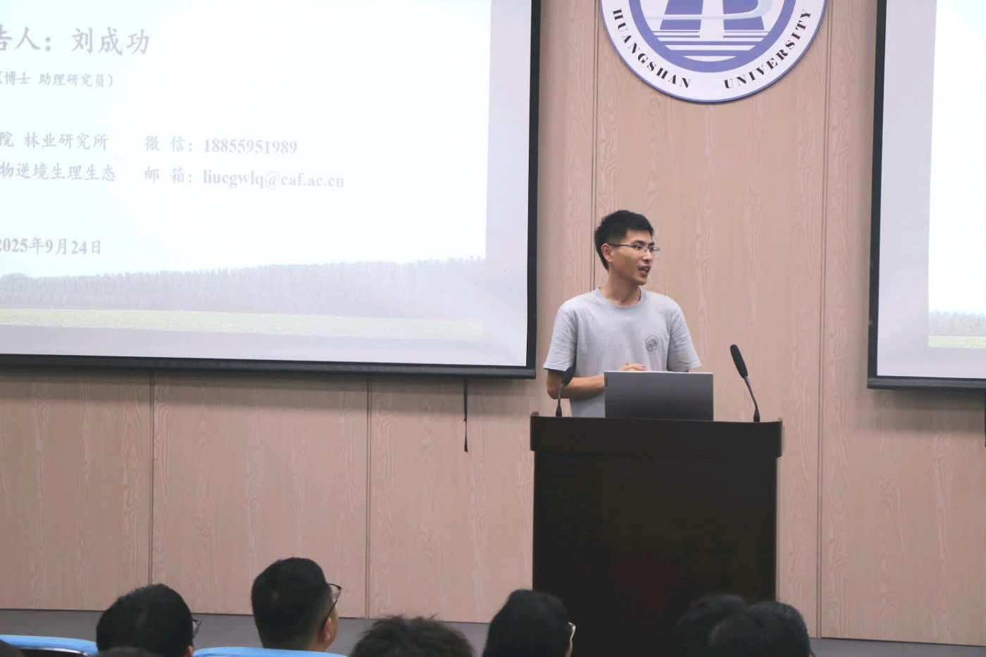 刘成功结合自身经历展开分享。他回顾了高考历程与大学阶段的心态变化,坦言最初加入项目组是为积累学分与综测成绩,却在参与过程中意外实现了实践能力与综合素养的双重提升,其真诚坦率的讲述引发在场学子共鸣。报告中,他回顾了从本科到博士阶段的学术进阶,从黄山学院林学专业开启林业领域的启蒙,到硕士、博士阶段深耕林木遗传改良研究,再到如今主持国家重点研发计划项目子课题、中央级公益性科研院所基本科研业务费专项资金项目等多个科研项目,骨干参与国家重点研发计划、国家自然科学基金等16项国家级项目。他以杨树遗传改良研究为例,分享了团队在种质资源收集与逆境生理研究中,如何面对野外采样的艰苦、实验重复的挫败,凭借“咬定青山不放松”的信念持续攻关。同时回忆了从本科到博士阶段,如何锚定林业科研的初心,在学业进阶与职业选择中坚定方向。