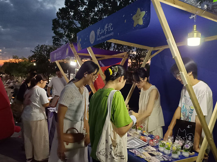9月27日晚,由黄山学院校团委主办、学生社团联合会承办的“新”期六听松社“创”市集在校园内热闹开展。本次活动以“创意与热爱”为主题,汇聚了国防育英部、艺创手工坊、徽州学社、青年志愿者协会、泉漫画社及大学生乡村振兴实践团队等多个学生组织,通过形式多样的展卖与互动,充分展现了当代大学生的创新活力与文化担当,部分活动收益还将用于公益事业,体现了同学们服务社会、传递温暖的责任意识。