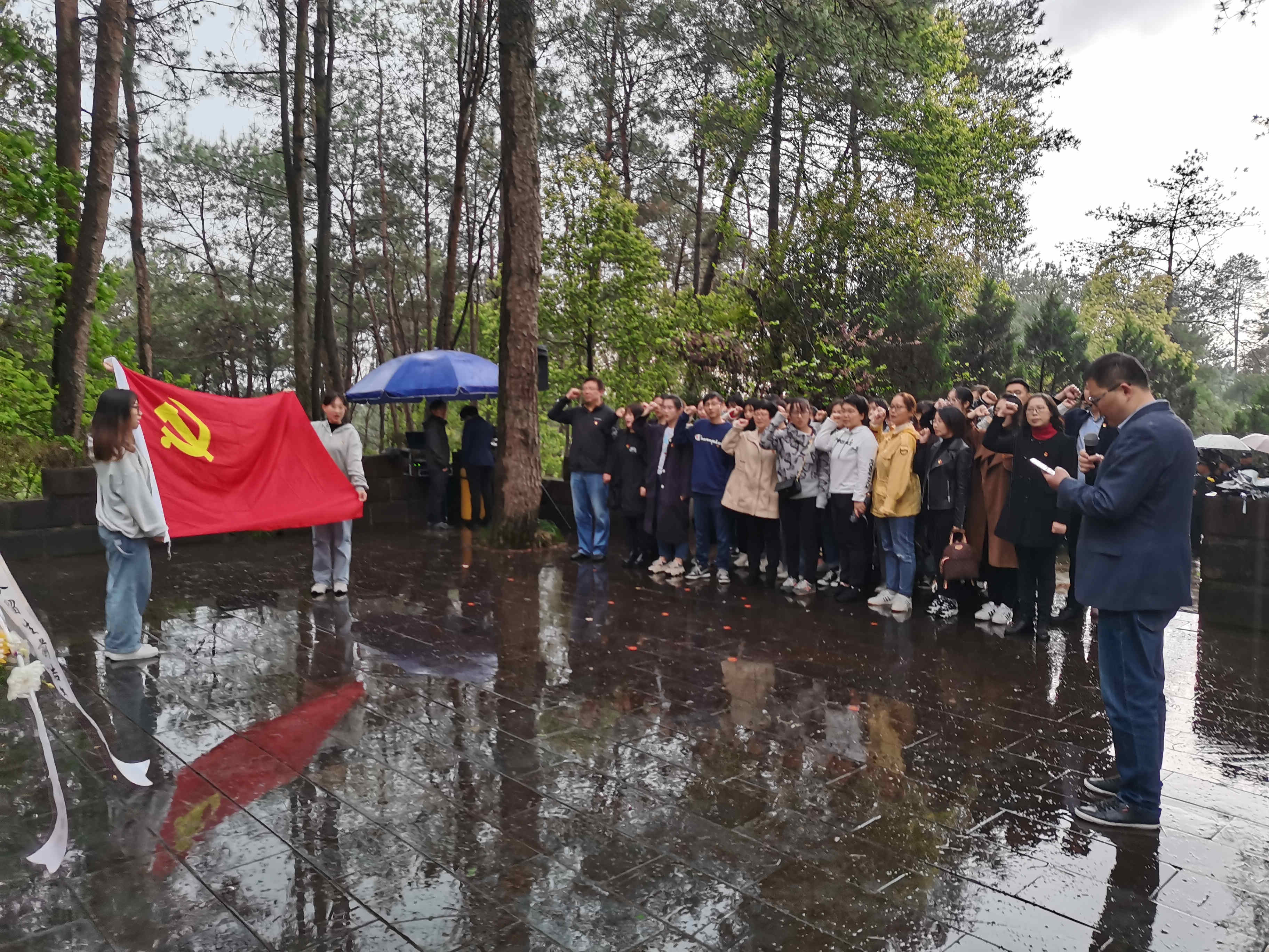 同志们满怀崇敬之情,列队步行来到纪念碑前,面向鲜红的党旗,高举右拳,庄严宣誓。通过重温入党誓词,追忆入党初心。之后,全体党员还参观了纪念碑底座四周的革命事迹简介、神道两边的浮雕,并瞻仰了纪念碑旁的烈士墓,深刻缅怀革命先烈的丰功伟绩。