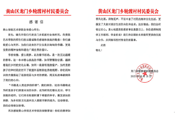 艺术学院教工第一、第二党支部向轮渡村送上“文化厚礼”,由学院党员师生精心募集的数百册图书,内容涵盖科普知识、文化教育等领域,搭建乡村接触艺术、学习知识的桥梁,受到当地干部群众的热烈欢迎。为回馈学院支部的暖心善举,轮渡村向两个支部赠送“知识搭桥连校村,善举添暖润民心” 锦旗与感谢信,以质朴方式见证校村携手共促发展的深厚情谊。