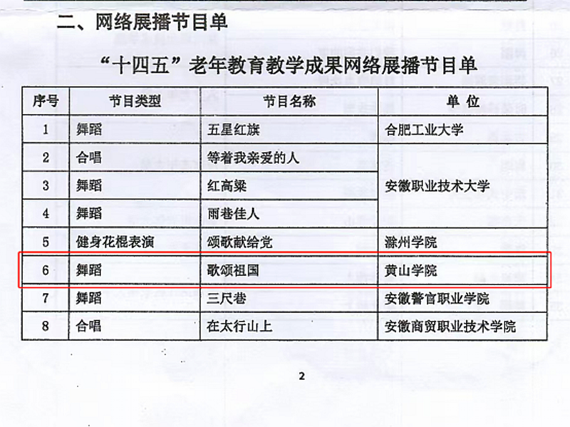 近日,安徽省老年大学协会、安徽开放大学发布《关于2025年全省老年教育教学成果展入选节目的通知》,我校老年大学选送的舞蹈节目《歌颂祖国》入选“十四五”老年教育教学成果网络展播节目单。