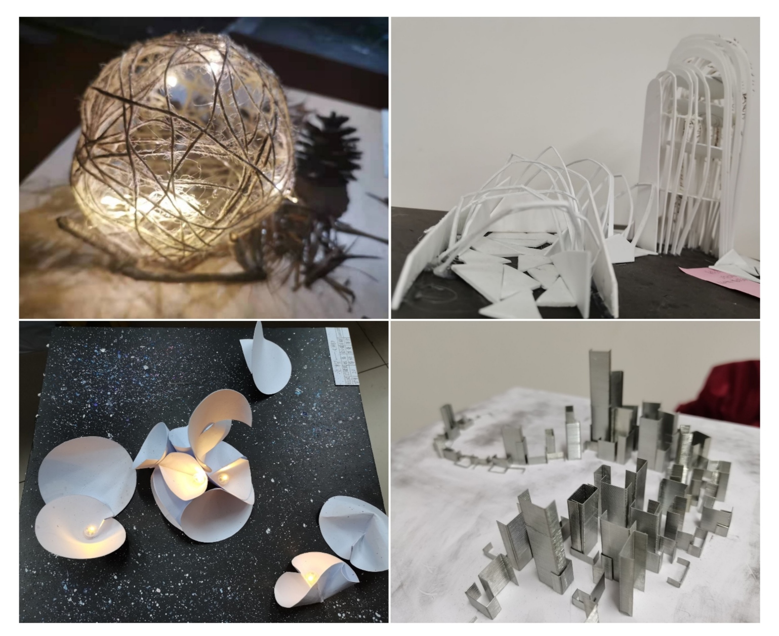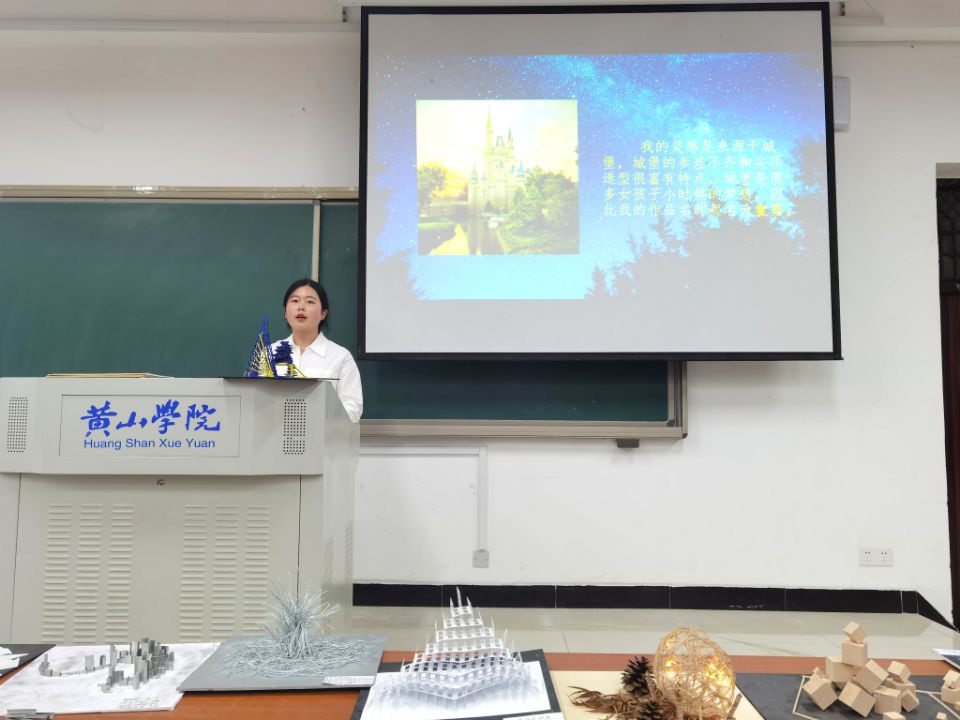 决赛中,参赛选手通过PPT展示和现场演讲的方式从作品的整体构造、立体结构、灵感来源、设计思路等方面进行展示,将特殊的材料与色彩进行组合搭配,展现了设计的美妙与精巧。经过激烈的角逐后,20建筑张丹妮同学的作品《自然》脱颖而出荣获一等奖。她的设计灵感来源于人类与自然的和谐共生,将麻绳、松树叶、松果、小树枝与小灯泡等材料进行了巧妙地结合,作品灵动富有生命力。