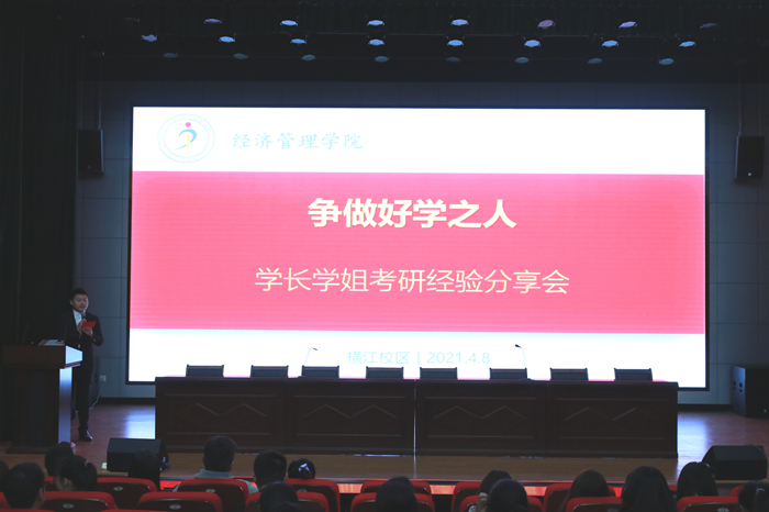 4月8日晚,经济管理学院在横江校区报告厅成功举办“争做好学之人”——学长学姐考研分享会,特邀6名拟录取优秀学生担任此次分享会主讲人,该院近300余人参加。