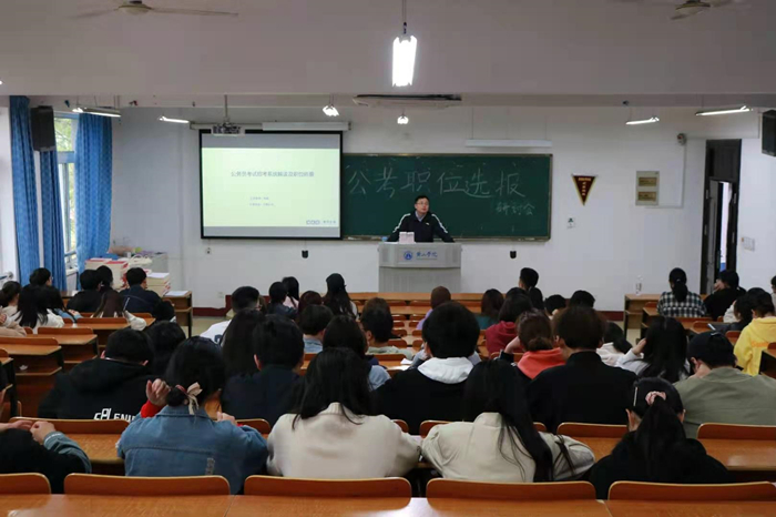 4月7日下午,经济管理学院在横江校区1301教室举办公务员职位报考指导讲座,特邀中博教育公考项目部指导老师周磊作为主讲人,学院百余名学生参加此次讲座。