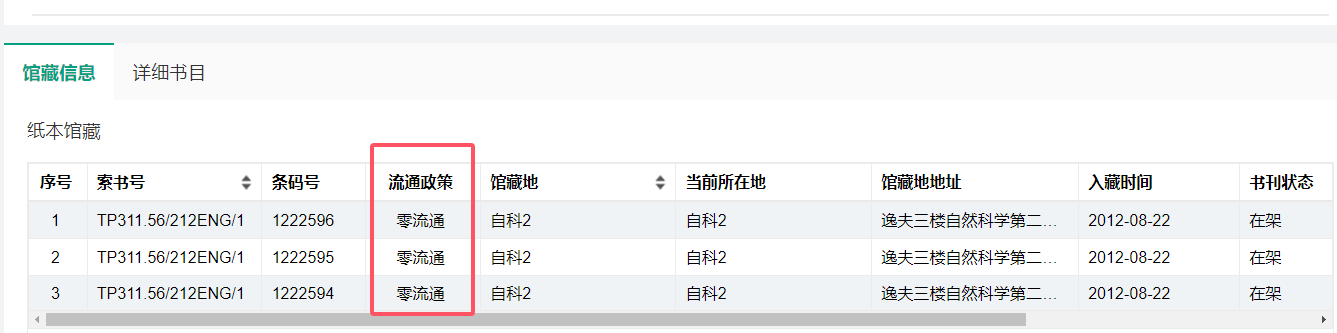 ① OPAC系统PC端:https://findhsu.libsp.cn(也可从图书馆官网主页进入),输入图书检索词查找目标图书,在馆藏信息的“流通政策”栏目中查看图书是否标注为 “零流通”(详见图1)。