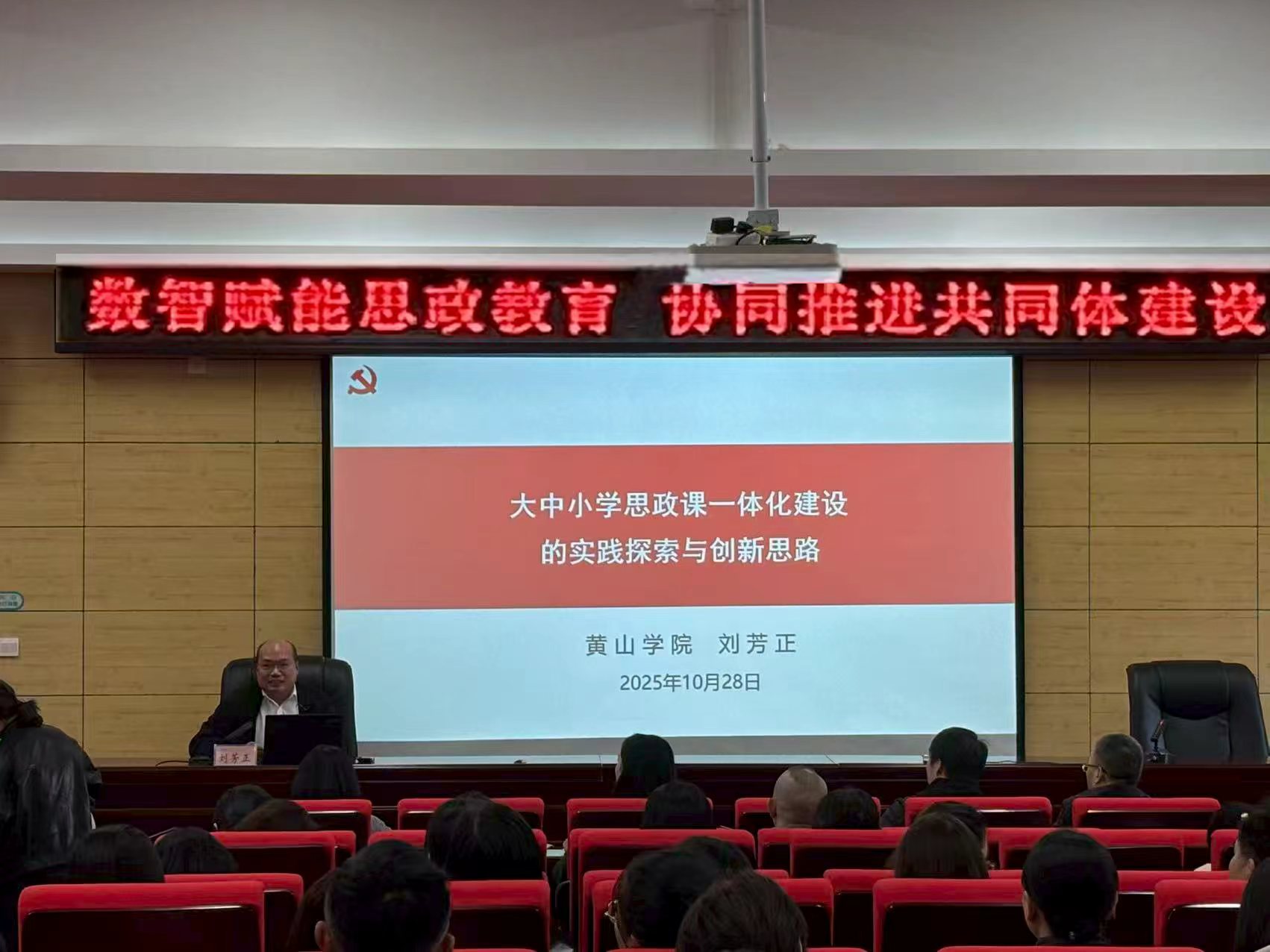 为深入贯彻落实新时代思政课建设要求,推动数智技术与思政教育深度融合,促进大中小学思政课一体化协同发展,10月28日上午,黄山市大中小学思政课一体化共同体单位教师研修培训在我校率水校区文昌楼211会议室举办。本次培训会以“数智赋能思政教育 协同推进共同体建设”为主题。会议由黄山学院马克思主义学院院长刘芳正主持。来自全市各大中小学思政课教师120余人参加会议。