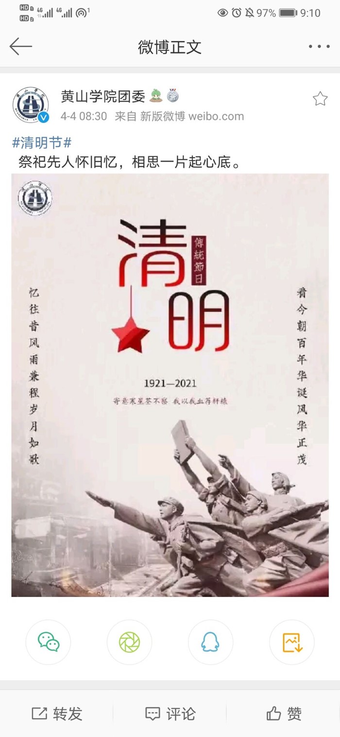 校团委新媒体中心通过微博、空间和微信公众号等新媒体平台对清明祭扫活动展开广泛宣传。微博发布清明主题海报、H5小程序;微信公众号推出诉清明愁思主题推文;抖音、微信视频号推出学党史、祭英烈专题视频,致敬英魂,缅怀先烈。展现革命英雄们在生命最后一刻牺牲小我成就大我的英雄气概。