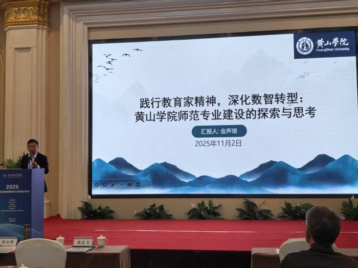 在高校交流发言环节,我校作为四所高校代表之一,由教务处处长金声琅以《践行教育家精神,深化数智转型:黄山学院师范专业建设的探索与思考》为题,介绍了我校师范专业在党建统领、培养体系优化、师资队伍建设、数智转型推进以及质量保障与文化育人等方面的实践与成效,展现了我校师范类专业建设的特色与亮点。