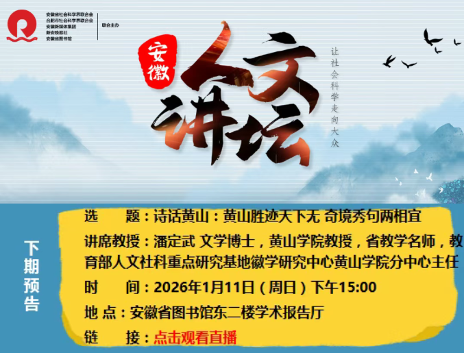 近日,安徽人文讲坛聘请我校文学院潘定武教授担任讲席教授,将于2026年1月11日(周日)下午15:00,在安徽省图书馆东二楼学术报告厅主讲“诗话黄山”专题,并同步在中安在线、大皖新闻等主流媒体平台直播。