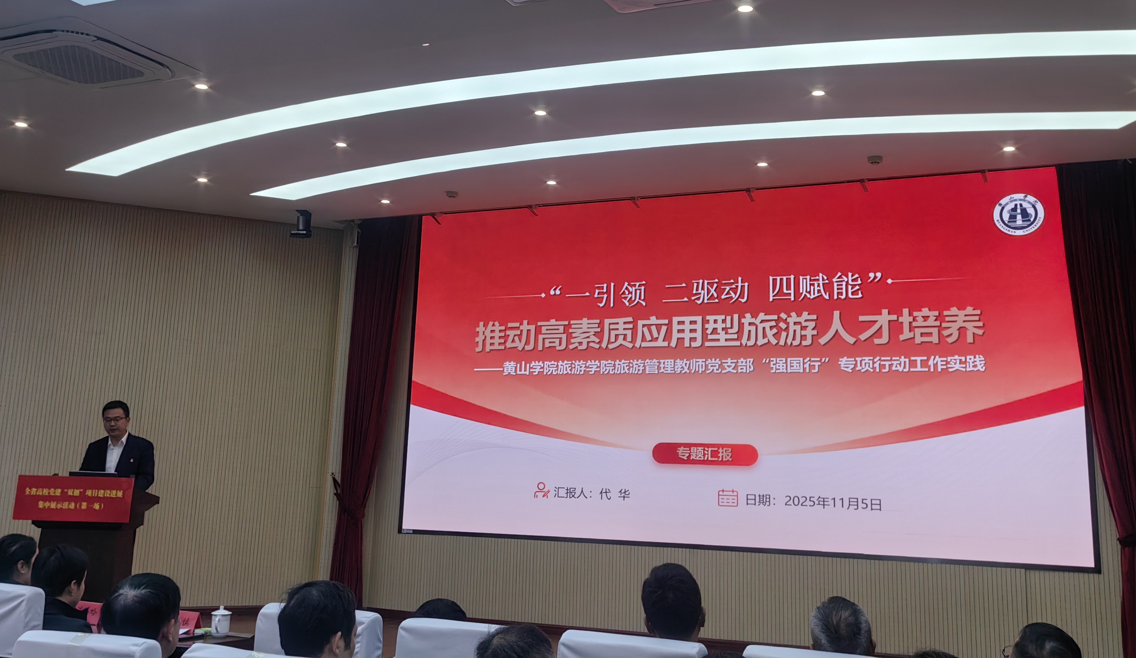 在交流发言环节,旅游管理教师党支部以《一引领二驱动四赋能:推动高素质应用型旅游人才培养》为题,系统介绍了支部自入选全国高校“双带头人”教师党支部书记“强国行”专项行动团队名单以来取得的成果,该支部坚持党建引领,聚焦服务国家重大战略和地方经济社会高质量发展,紧密围绕黄山市优质的旅游资源和厚重的徽州文化,以文旅融合、产业融合打造“双轮驱动”的育人新模式,构建党建联建、教育服务、科技赋能、实践育人的“四赋能”产教融合协同工作机制,助推党建工作与业务发展同频共振,为地方社会发展提供了有力支撑。支部的创新举措、特色亮点及经验成果获得参会人员的一致好评。