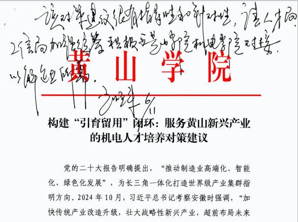 近日,由我校机电工程学院教师徐勇、曹守臻撰写的咨政报告《构建“引育留用”闭环:服务黄山新兴产业的机电人才培养对策建议》获市领导肯定性批示。