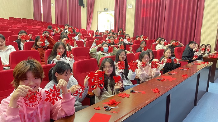 在实践操作环节中,吴老师指导同学们进行沉浸式创作,从对称窗花的折叠对齐,到喜字轮廓的精准勾勒,再到昆虫造型的细节修剪,大家专注细致,相互交流技巧。在吴老师的耐心指导下一张张普通的红纸逐渐变成了寓意吉祥的窗花、喜庆大气的喜字、栩栩如生的昆虫,课堂上满是成就感与欢声笑语。
