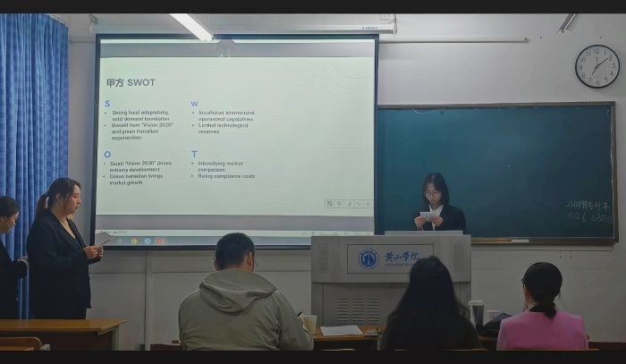 比赛分为初赛和复赛两个阶段。初赛采用PPT展示与案例分析的形式。各参赛团队需在9分钟内用英文进行演说,且全体成员都要参与其中。选手们围绕大赛案例,从市场环境剖析、合作策略制定到潜在风险评估,进行了全面且深入的展示。复赛进入更为紧张刺激的一对一正式谈判环节。选手们围绕商业合作条款,自由发言、据理力争。谈判过程中,大家十分注重谈判礼节,言辞礼貌又不失强硬,充分展现了良好的商务素养。25分钟的谈判时间里,现场气氛紧张而有序,各方你来我往,不断试探与妥协,力求达成最优合作方案。