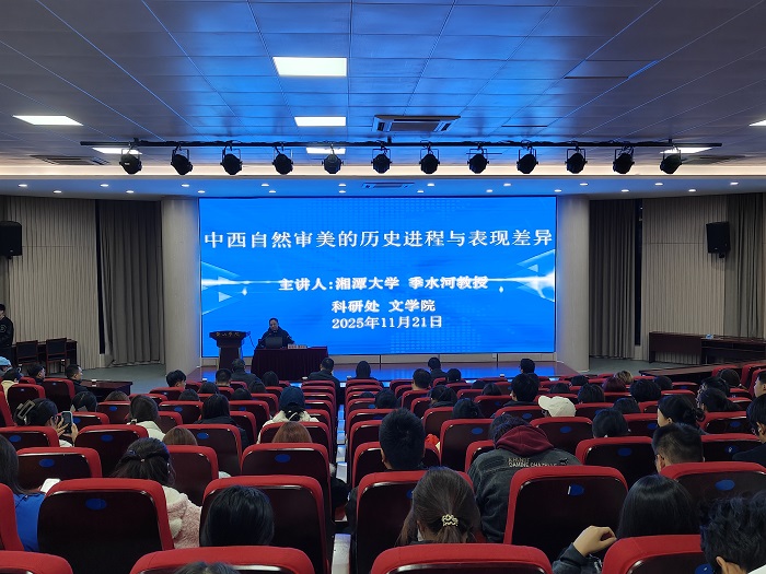 11月21日晚,湘潭大学二级教授,博士生导师季水河应邀在我校文端楼二楼报告厅,作题为《中西自然审美的历史进程与表现差异》学术报告。报告由文学院副院长朱宏胜主持。上海社科院博士生导师马驰教授、上海社科院助理研究员周丰博士及文学院师生近200人参加活动。