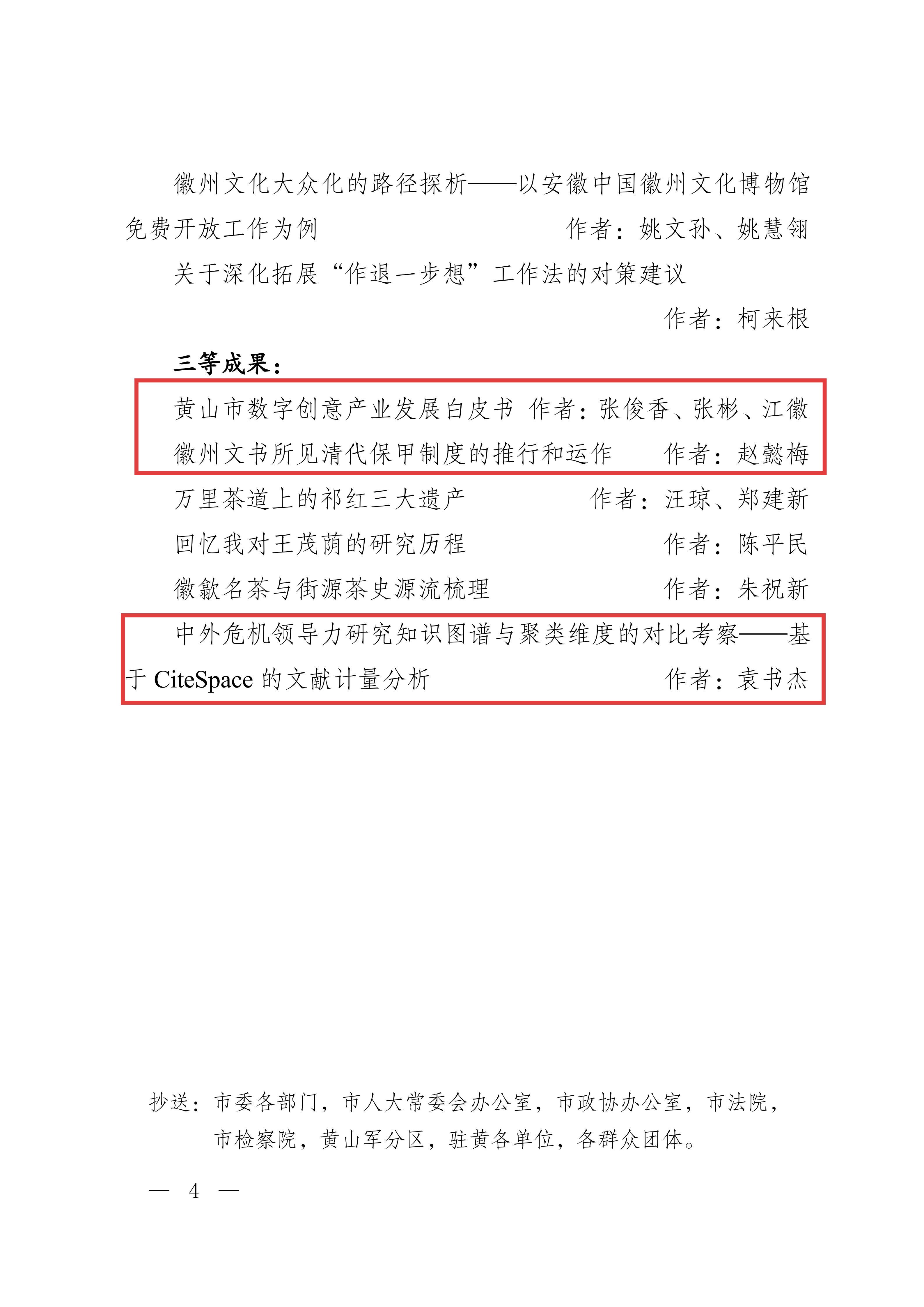 近日,2022—2023年度黄山市社会科学优秀成果奖评审结果公布,我校8项成果获奖。其中著作类一等奖1项,二等奖2项;论文类一等奖1项,二等奖1项,三等奖3项,在获奖质量和数量上较往届均有明显提升。