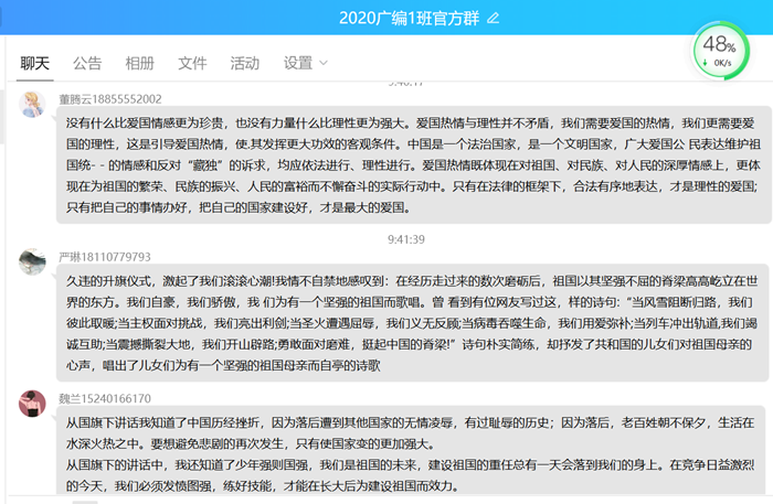 升旗仪式之后,20广编2班张心怡同学作为学生代表进行题为“胸怀千秋伟业,恰是百年风华”的国旗下演讲:“曾几何时,我看到充满希望的春天和一个美好的时代;我在青山绿水间发现万家灯火;我在稻香里和机器并肩,听取蛙声一片。这是我们心中祖国的蓝图,更是中国共产党运筹帷幄下所带来的浓墨重彩……”激情的演讲感染了在场的每一位师生。活动结束后,同学们纷纷在线上分享学习心得,交流活动体验。