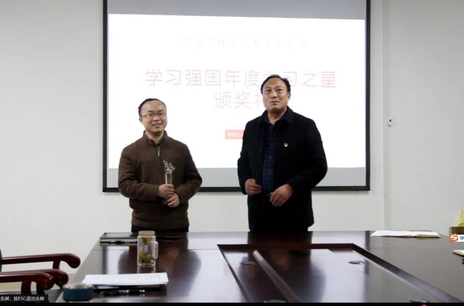 4月14日下午,信息工程学院教工党支部在院会议室举行2021年度一季度学习强国“学习积极奖”颁奖仪式,仪式由支部副书记韩静主持。