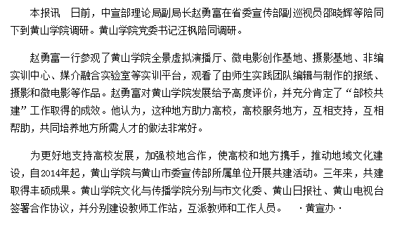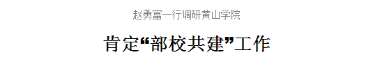 4月18日,《黄山日报》以《赵勇富一行调研黄山学院肯定“部校共建”工作》为题,报道中宣部理论局副局长赵勇富到我校调研。