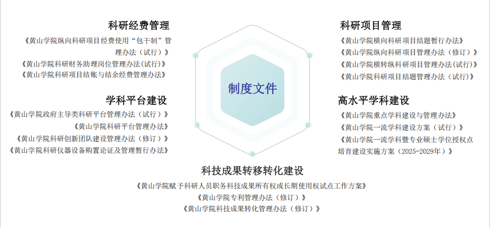 出台《黄山学院科研突出贡献奖励办法(试行)》和《黄山学院优秀科技工作者评选办法(试行)》,进一步加大对原创性、高水平成果的激励力度,引导科学研究从重数量向重创新、重质量转变。
