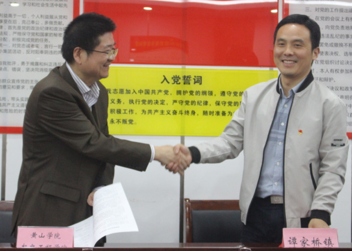 会前,在镇党委书记刘霞光、镇长周亮的陪同下,机电工程学院党委书记蔡康松,党委副书记、院长施云贵,党委副书记夏广平、党委成员以及党支部书记实地调研东黄山国际小镇。随后,镇长周亮介绍全镇发展情况,蔡康松介绍学院概况。双方签订了《党组织结对共建协议书》。