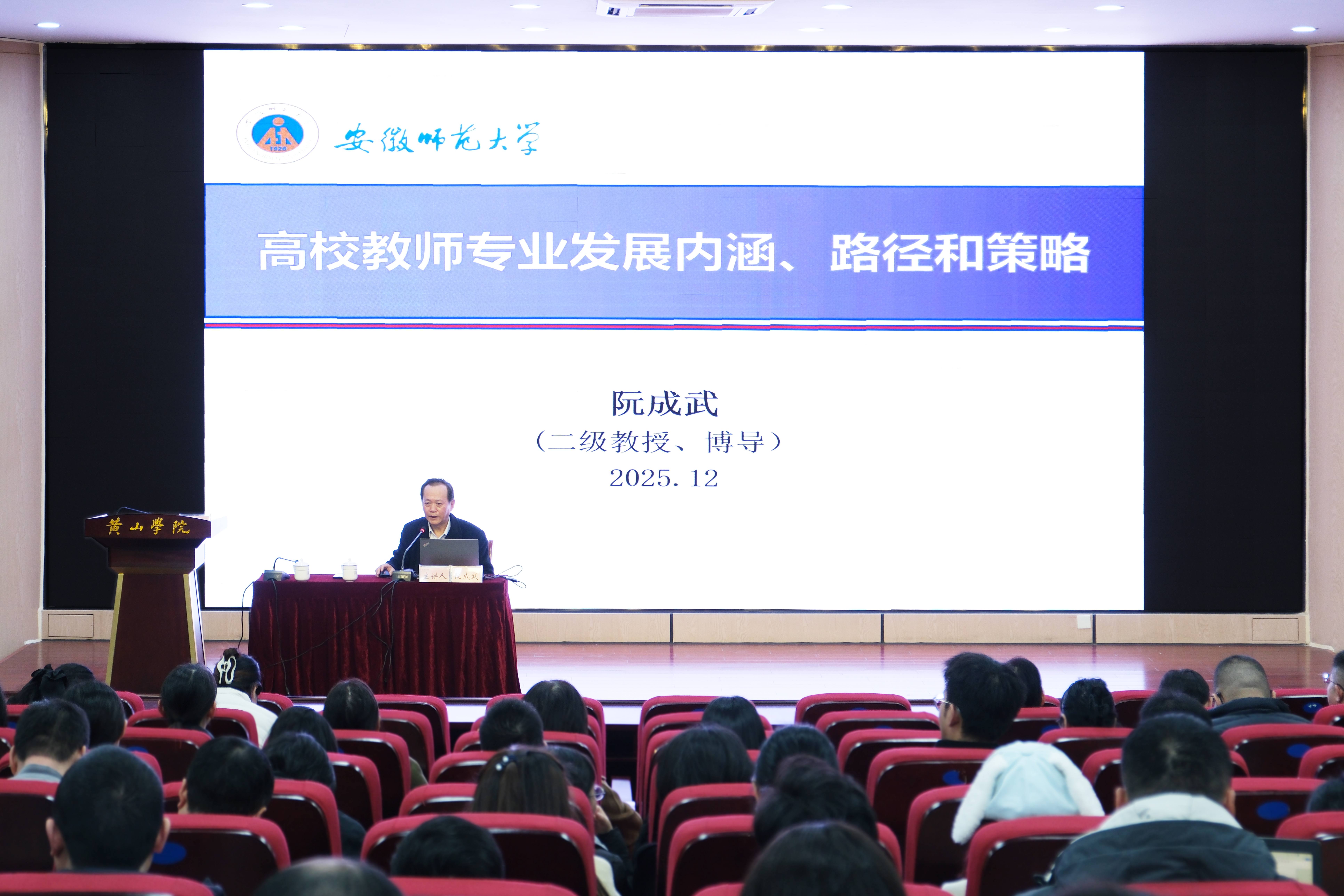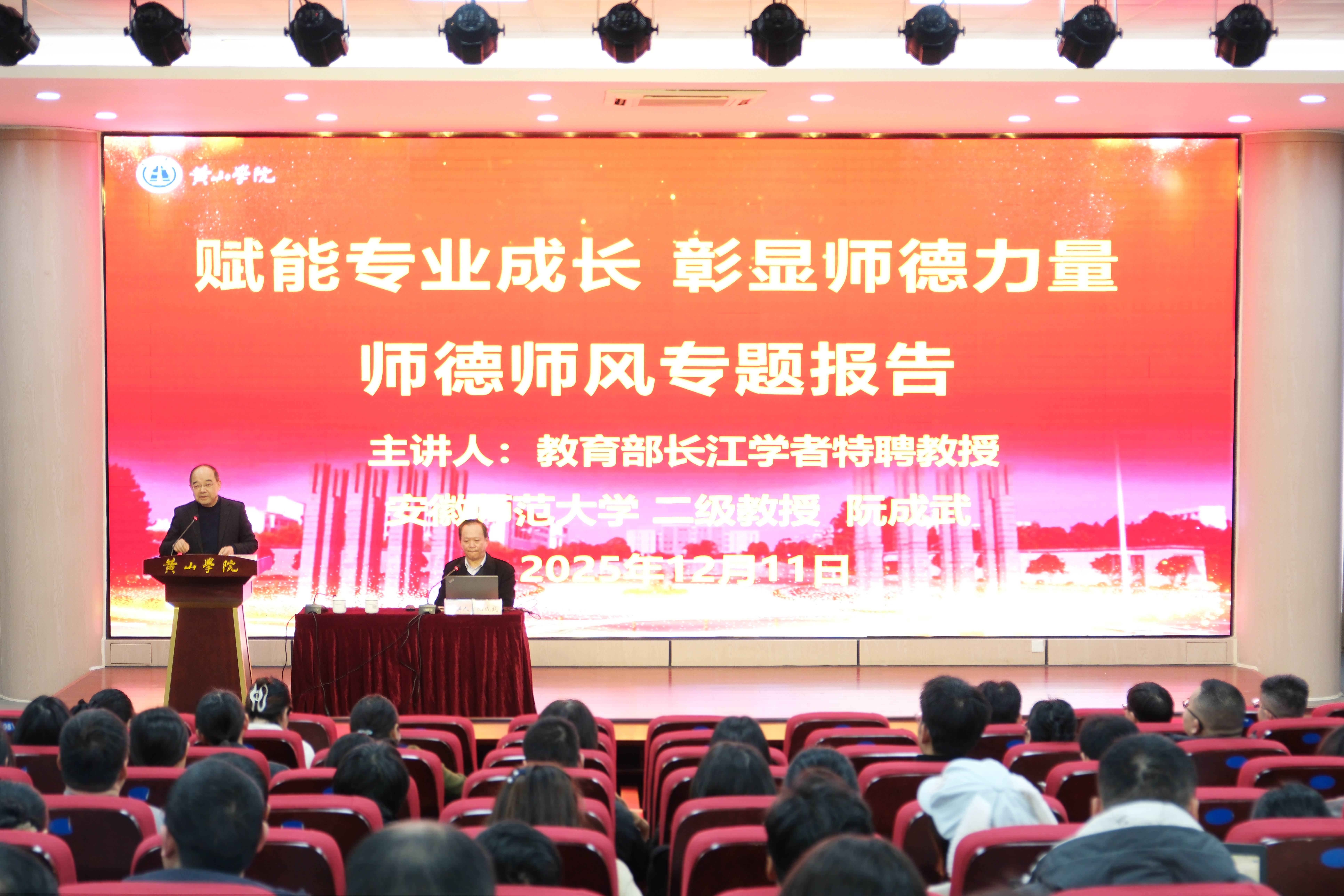 12月11日下午,我校在文端楼二楼报告厅举办“赋能专业成长 彰显师德力量”师德师风专题报告会。教育部长江学者特聘教授、安徽师范大学教育科学学院二级教授阮成武应邀来校作专题报告。报告会由校党委委员、副院长张小明主持。