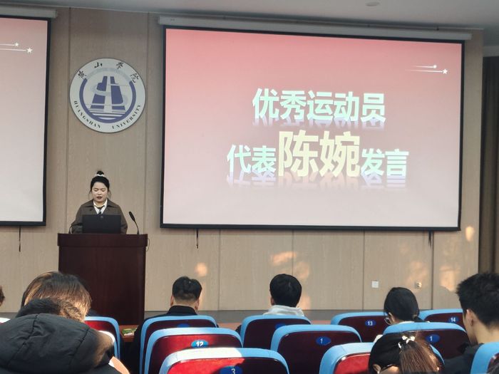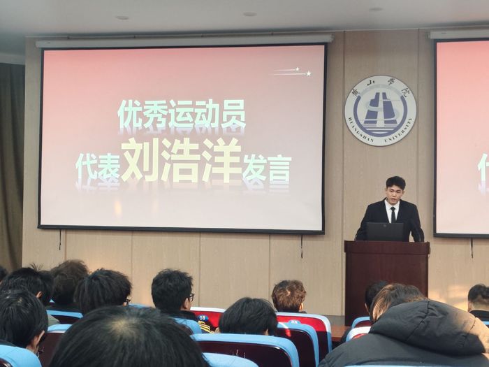 优秀运动员代表分享了各自的赛场感悟与成长收获。校、院两级篮球队队长刘浩洋以“团队与坚持” 为核心,讲述了自己从院队新人到校队队长的蜕变历程。“篮球赛场上,没有孤军奋战的英雄,只有并肩前行的队友。” 他结合本届体育文化节篮球赛的参赛经历,谈到团队协作与永不言弃的精神在夺冠路上的重要意义,鼓励同学们将赛场精神融入学习科研,在追梦路上勇毅前行。院排球队队长陈婉从“突破与成长” 角度分享心得。她表示,体育不仅教会她强健体魄,更让她学会在挫折中调整心态、在压力下突破自我。“每一次起跳扣杀,都是对极限的挑战;每一场团队协作,都是对凝聚力的锤炼。”