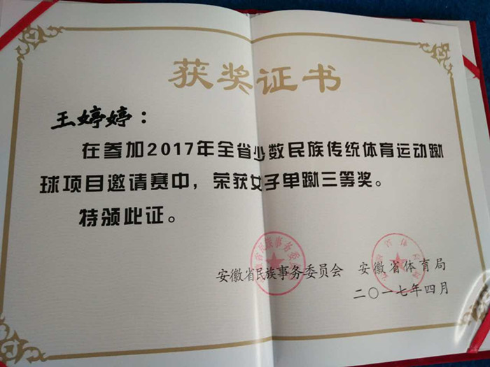 4月25—26日,由安徽省民族事务委员会、安徽省体育局主办,合肥市民族事务委员会、合肥市体育局、肥东县人民政府承办的“安徽省2017年少数民族传统体育运动蹴球项目邀请赛”在肥东县牌坊回族满族乡举行。来自全省11个市的代表队参加了比赛,5市派员观摩学习。由我校14休闲体育的汤涛、14环境艺术设计的王盼盼、15土木工程的钟洋和16音乐学的王婷婷等四名少数民族队员组成的黄山市少数民族代表队,参加了本次邀请赛。参加蹴球训练仅1个月的蹴球新手王婷婷,在与强手的竞赛中不畏竞争,发挥出色,在女子单蹴比赛中并列第三名,获得三等奖。
