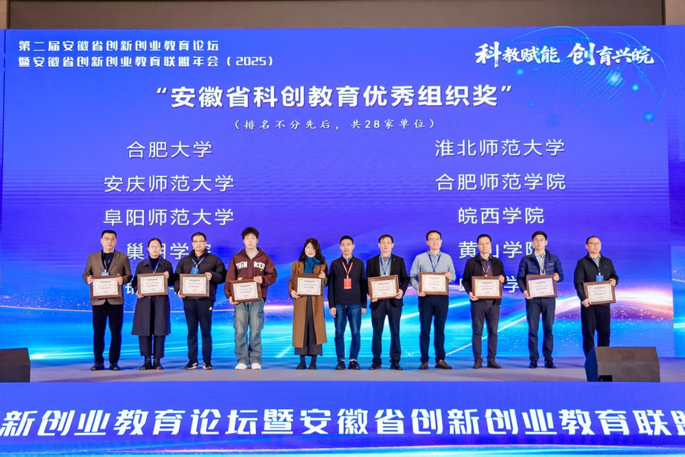 12月19至20日,第二届“安徽省创新创业教育论坛暨2025年安徽省创新创业教育联盟年会”在合肥举行。我校凭借在创新创业教育领域的丰硕成果,获评“2025年度安徽省科创教育优秀组织奖”。