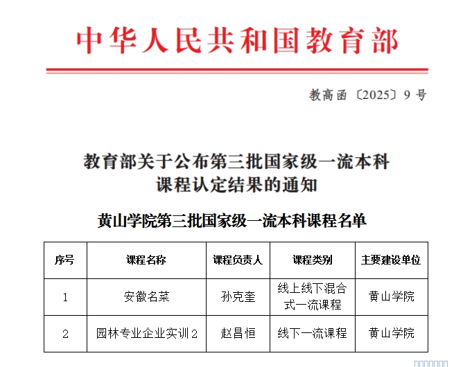 近日,教育部正式发布《教育部关于公布第三批国家级一流本科课程认定结果的通知》(教高函〔2025〕9号),我校《安徽名菜》与《园林专业企业实训2》两门课程成功入选。截至目前,我校国家级一流本科课程总数已增至4门。《安徽名菜》课程由孙克奎教授担任负责人,课程团队主要成员包括姜薇、朱红兵、代华、金声琅等教师。《园林专业企业实训2》课程则由赵昌恒教授领衔,课程团队其他主要成员有马涛、蒋小凡、伍全根、严迪等教师。