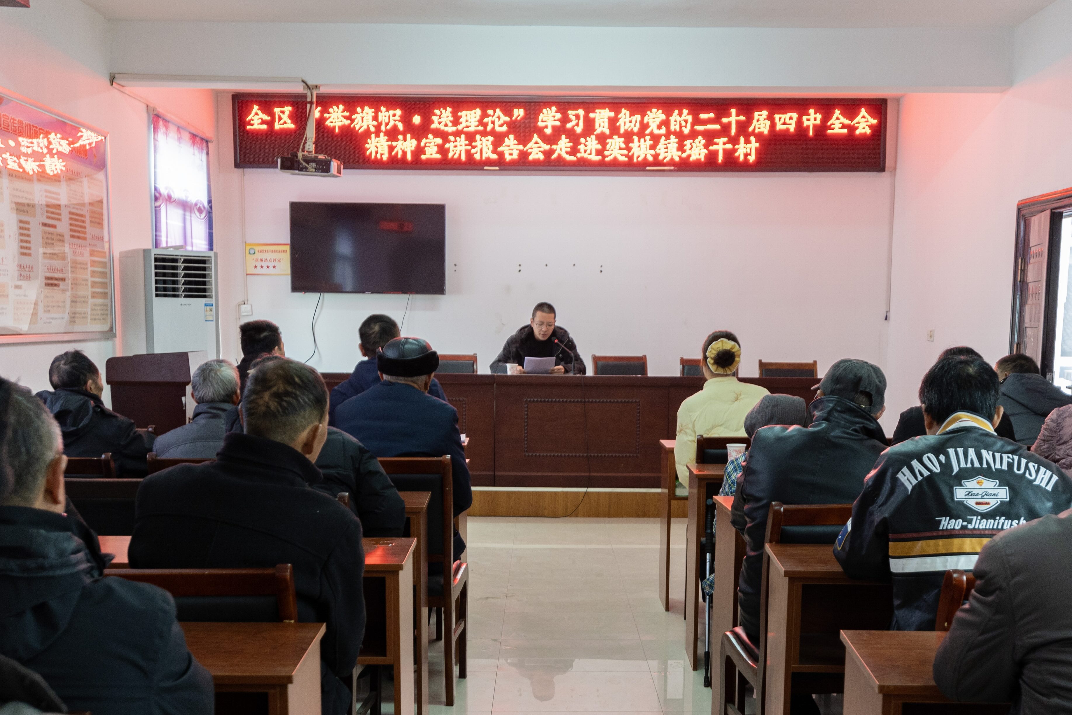 12月26日,艺术学院学生第三党支部书记、屯溪区“举旗帜 送理论”宣讲团成员蒋家伟到屯溪区奕棋镇瑶干村进行党的二十届四中全会精神宣讲。