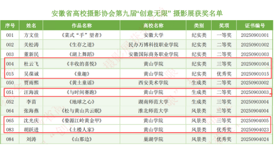 本次高校摄影比赛面向全国高校师生,全国51所高校共798件作品参赛,涵盖风光纪实、人文百态、创意摄影等多个类别。黄山学院老年大学摄影班师生组成“银发摄影队”踊跃参赛,学员们以镜头为笔,以光影为墨,聚焦地方文化、乡村振兴、邻里温情、自然之美等多元主题,既有对山河壮阔的恢弘呈现,也有对生活细节的细腻捕捉。用镜头诠释了“活到老、学到老”的人生态度,也为摄影艺术注入了温暖的文化力量。