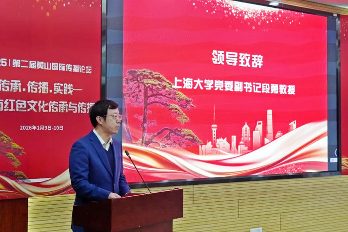 段勇在致辞中表示,上海大学将以本届论坛为纽带,进一步整合政产学研用多方资源,深化校校、校地协同协作机制,推动红色文化在新时代实现创新性传播,持续扩大其国际影响力与感召力。