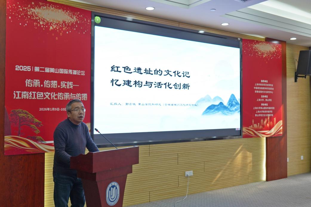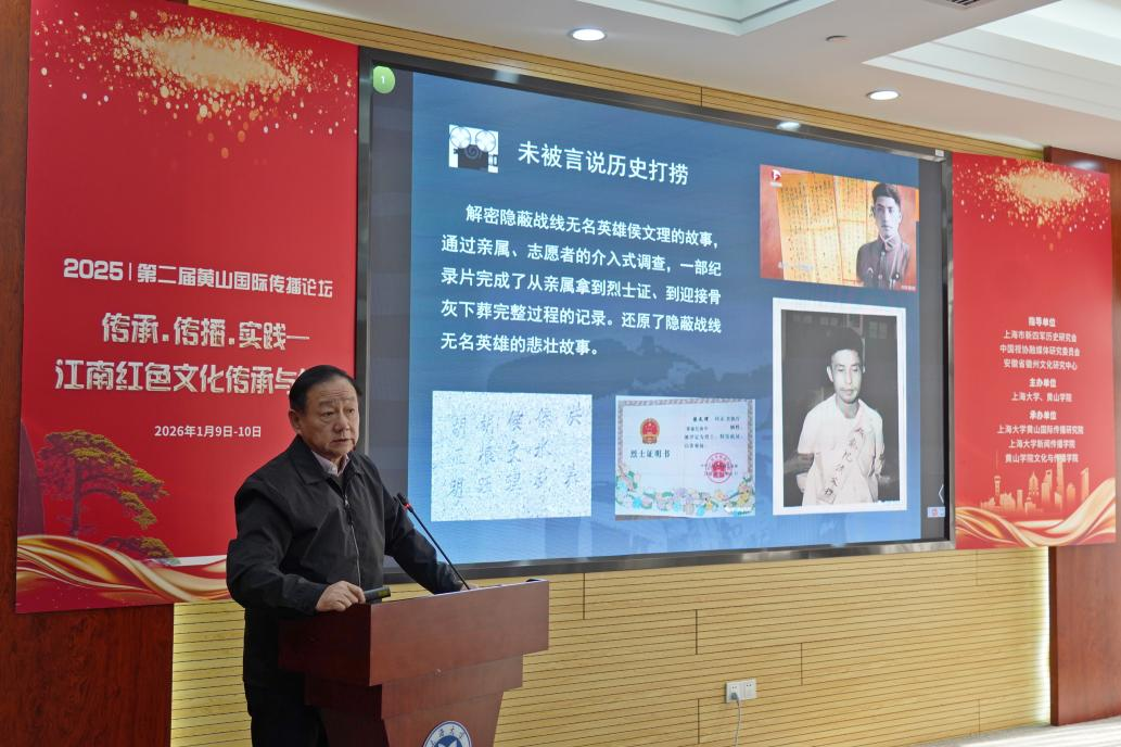 1月10日,2025第二届黄山国际传播论坛在上海大学延长校区举行。上海大学党委副书记段勇、黄山学院副院长姜红、上海市新四军历史研究会副会长兼秘书长曹景文等来自高校、媒体与文化机构60余名代表出席开幕式。本次论坛以“传承.传播.实践—江南红色文化传承与传播”为主题,设置专家主旨论坛和三个平行分论坛环节。论坛还为两校联合举办的主题文创大赛获奖学生代表颁奖,并向论坛获奖学术论文作者颁奖。
