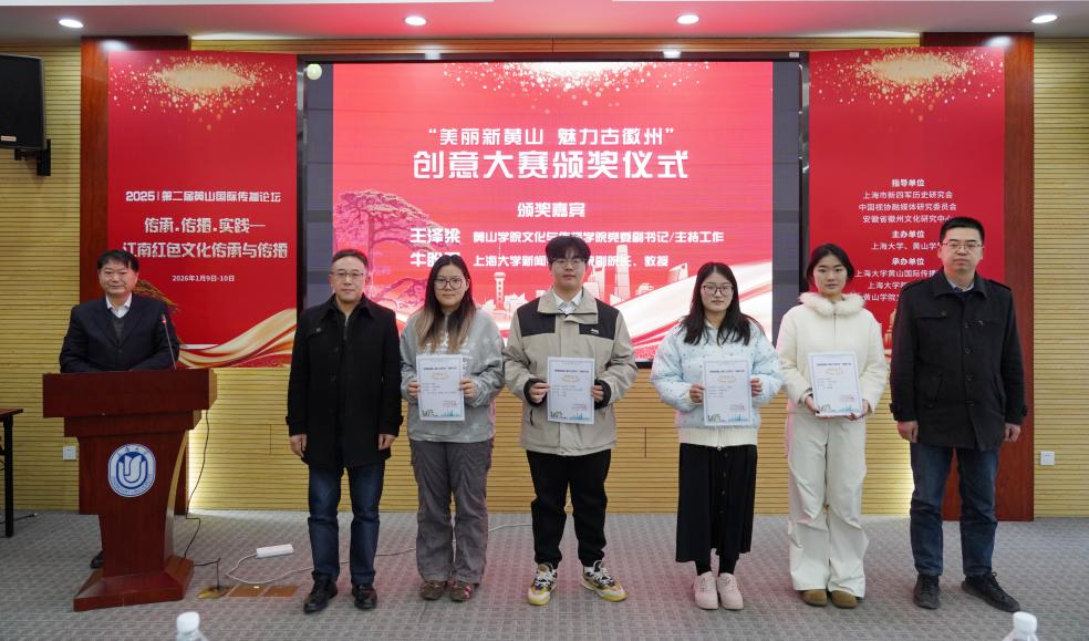 为学习贯彻习近平文化思想和习近平总书记考察安徽重要讲话精神,挖掘传承徽州文化,传播黄山致美胜景,2025年两校联合举办“美丽新黄山,魅力古徽州”创意大赛。大赛设置视频、摄影、文创等三个单元,收到来自两校学生创作的三类作品共144件。本次论坛现场为两校获奖学生代表颁奖。