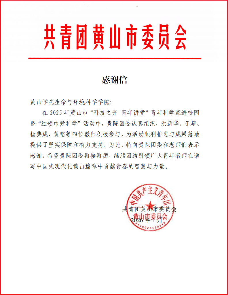 近日,生命与环境科学学院联合共青团黄山市委员会组织开展的“科技之光・青年讲堂”系列科普活动圆满结束,并获黄山团市委致信感谢。活动累计走进黄山市八所中小学,开展科普宣讲8场,覆盖学生近两千人次,有效推动了科技教育与青春实践的深度融合。