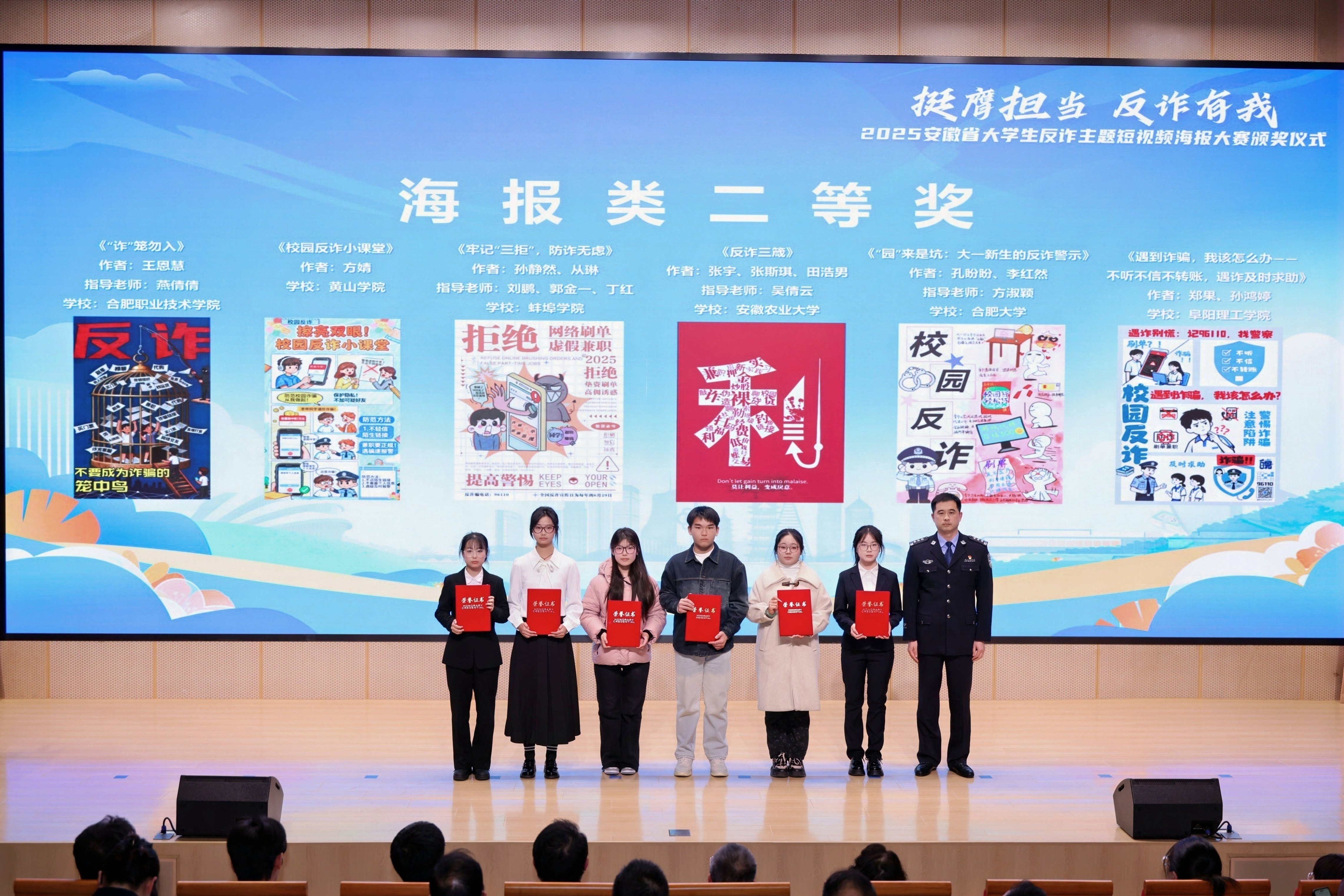 此次赛事由安徽省通信管理局、安徽省公安厅、安徽省教育厅、共青团安徽省委员会、安徽省学生联合会共同主办,以“挺膺担当,反诈有我”为主题,旨在提升大学生防范电信网络诈骗的意识和能力。大赛共吸引全省超110所高校、5000余名学生参与创作,经过初筛和两轮评审,短视频、海报类各评选出一等奖2个,二等奖6个,三等奖10个,20所高校获评优秀组织奖。