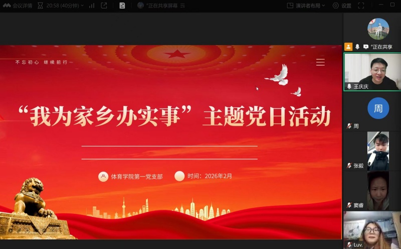 2月27日,为充分发挥学生党员先锋模范作用,引导青年学子扎根基层、服务群众,以实际行动践行初心使命。体育学院学生第一党支部党员们在线上围绕返乡开展“我为家乡办实事”主题实践活动进行交流。